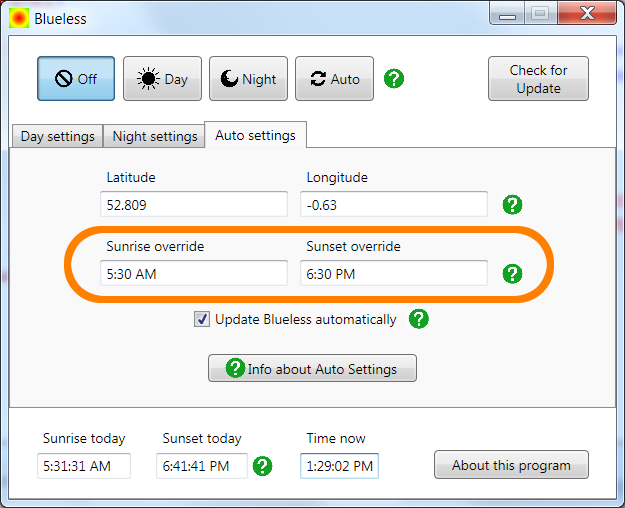 For example, if you enter 5 am in Sunrise Override and 7 pm in Sunset Override you will get 14 hours of simulated daylight from your screen even in winter when days are shorter.